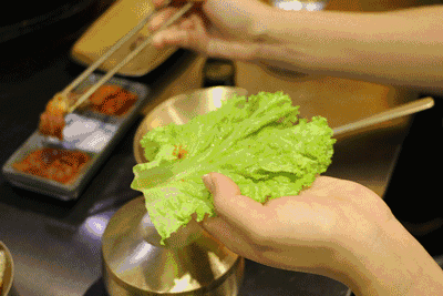 相比于猪五花,牛五花更有嚼劲,吃起来也更紧实。肥瘦相间的五花肉在滚烫的烤盘上雀跃,稍等片刻,就可以食用,烤好的五花和蒜片、辣椒、泡菜一起包在新鲜的生菜叶儿里放入口中,幸福感油然而生一定要一口干掉,才幸福。