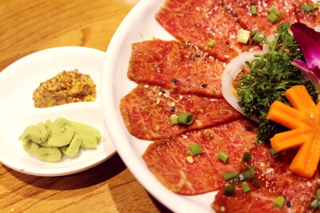 每一块和牛都被悉心照料,发出滋滋的声音,在兼具熟肉的油香和生肉的鲜醇时,呈入你的盘中。食材精致,调味也要够劲道,芥末和芥末子让你来感受牛肉与芥末缠绵以后的口感,怕芥末的小伙伴们不用担心,这款调味酱不会太呛。