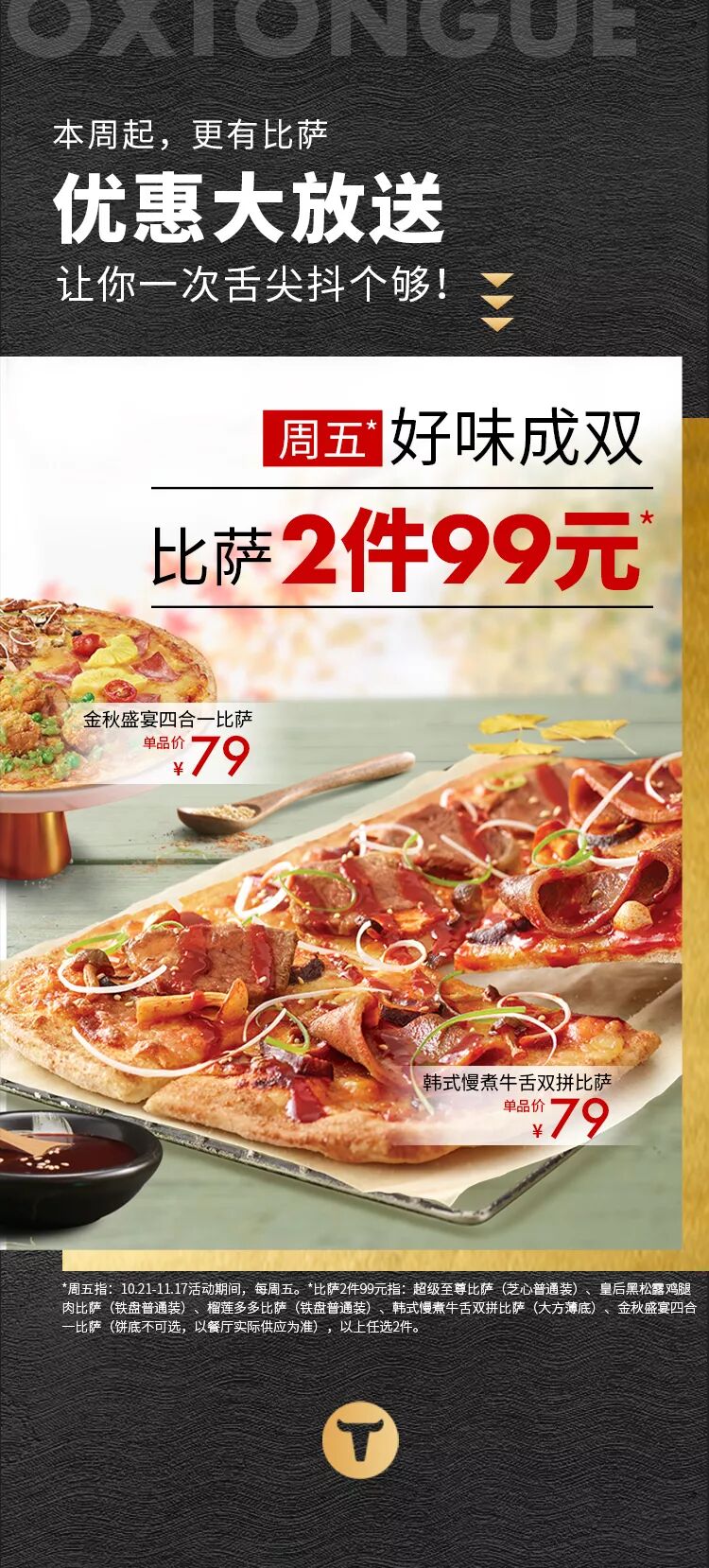 在留言区分享#你最喜爱的披萨口味#,点赞量最高的小可爱,我们请你吃必胜客韩式慢煮牛舌双拼披萨!