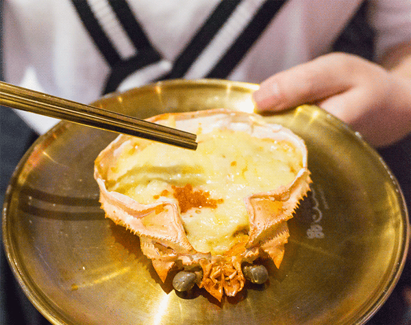 可别小看这份芝士焗蟹宝,它可是一个宝藏男孩,芝士的外衣下填充着蟹肉、肉松和鱼籽,烤熟后用筷子夹起,看这优秀的拉丝,不拍个抖音简直太可惜!