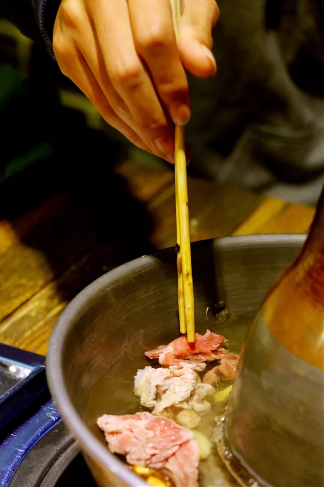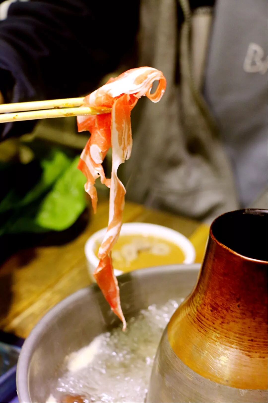 大片的羊肉卷在滚腾的锅子中涮上几秒