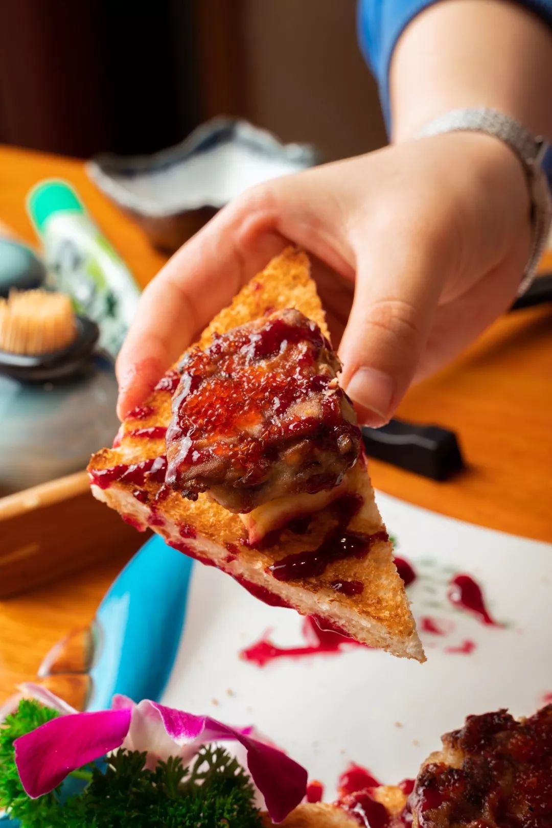 想要回本怎么能少了高级鹅肝!丰腴饱满的鹅肝在舌尖呈现绵密的质感,覆上的吐司焦脆爽口,唇齿生津,勾起心中狂野的猛兽。