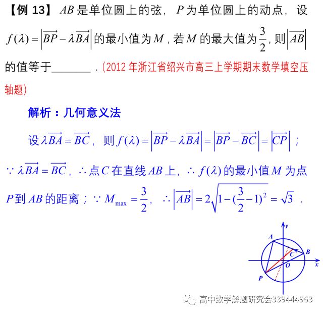 所谓几何法就是把向量问题利用平面几何的思想和方法,转化为几何问题,再用几何方法解决。几何法中有几个基本的问题必须十分清楚,共线问题、共点问题、构造三角形、解三角形等等。