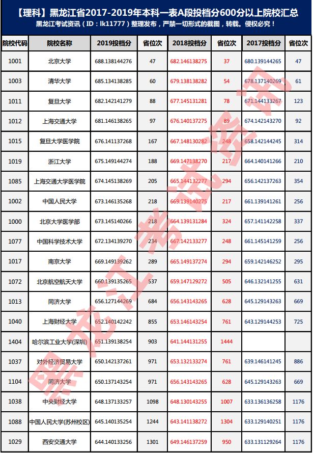 2、本文仅整理2017-2019年黑龙江省高考理工类一本A段投档分数线在600分以上的院校名单,每年各分数段院校略有变动。