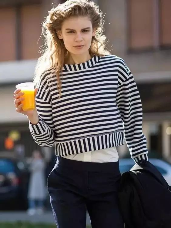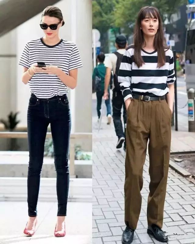 条纹衫叫人又爱又恨,选对的时候显瘦,选错的时候显胖。而紧密的细条纹,会比宽大的粗条纹要好。