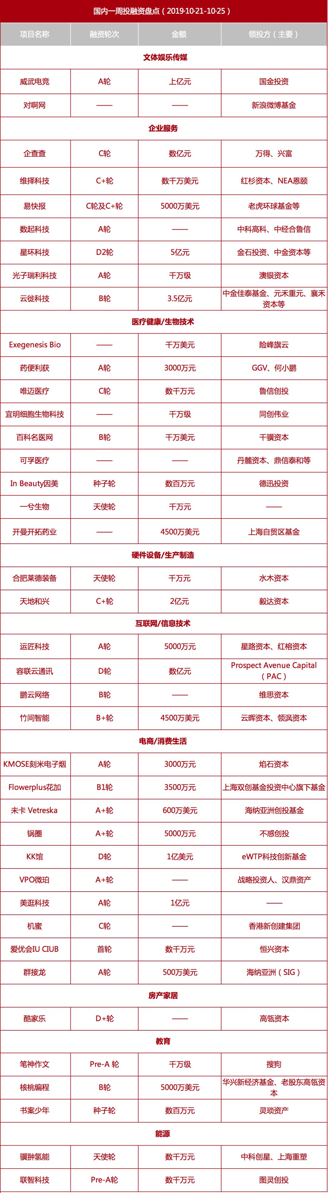 本周(2019·10·21-10·25)国内外共有40起融资事件,分布在13个行业中。其中,电商/消费生活10起,医疗健康/生物技术9起,企业服务7起,互联网/信息技术4起。