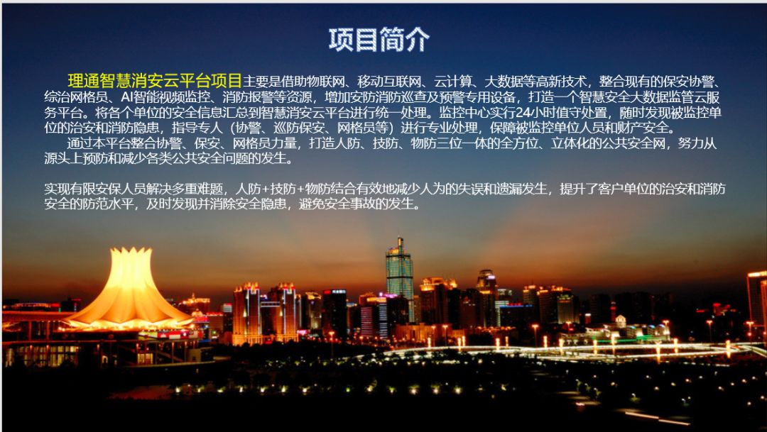今天来到我们《創客廰》的企业是南宁理通保安服务有限公司带来的理通智慧消安云平台项目。理通消安云平台:主要是借助物联网、移动互联网、云计算、大数据等高新技术,整合现有的各单位保安、消控室以及人工智能等资源,增加用电安全巡查及预警专用设备,打造一个智慧安全大数据监管综合云服务平台为客户提供云服务。