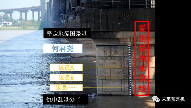 用图片来说明一下。下图是一座大桥,桥墩上面的黑白标尺叫做水位警戒标尺,用来标识水位是高还是低。如果我们把这个水位警戒标尺作为香港官员的爱国爱港水位线。水位线最高的是坚定地爱国爱港的,水位线最低的是仇中乱港的分子。那么,在立法会的约70位议员里,能敢于谴责暴徒的何君尧议员可以放在最高的位置。