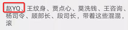 俞渝估计觉得赵英奇也是个公众人物,在爆料文中没打出赵英奇的名字,只打了赵英奇的名字拼音,大家也不敢确认这个“赵yq”就是他。
