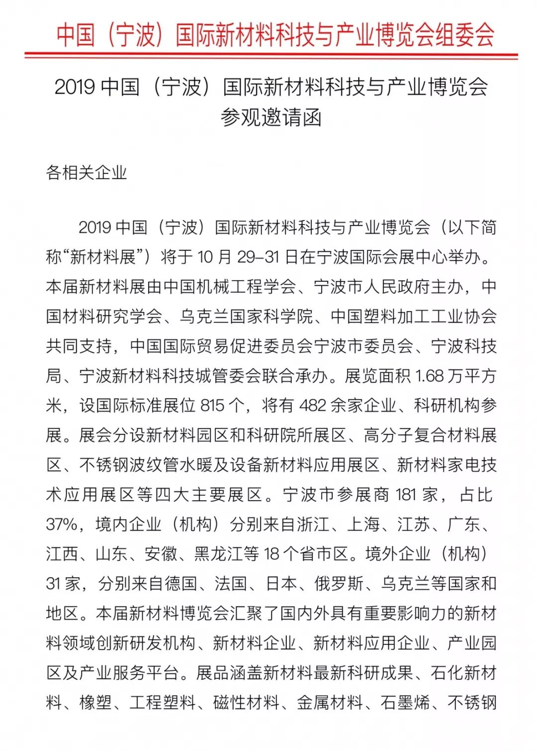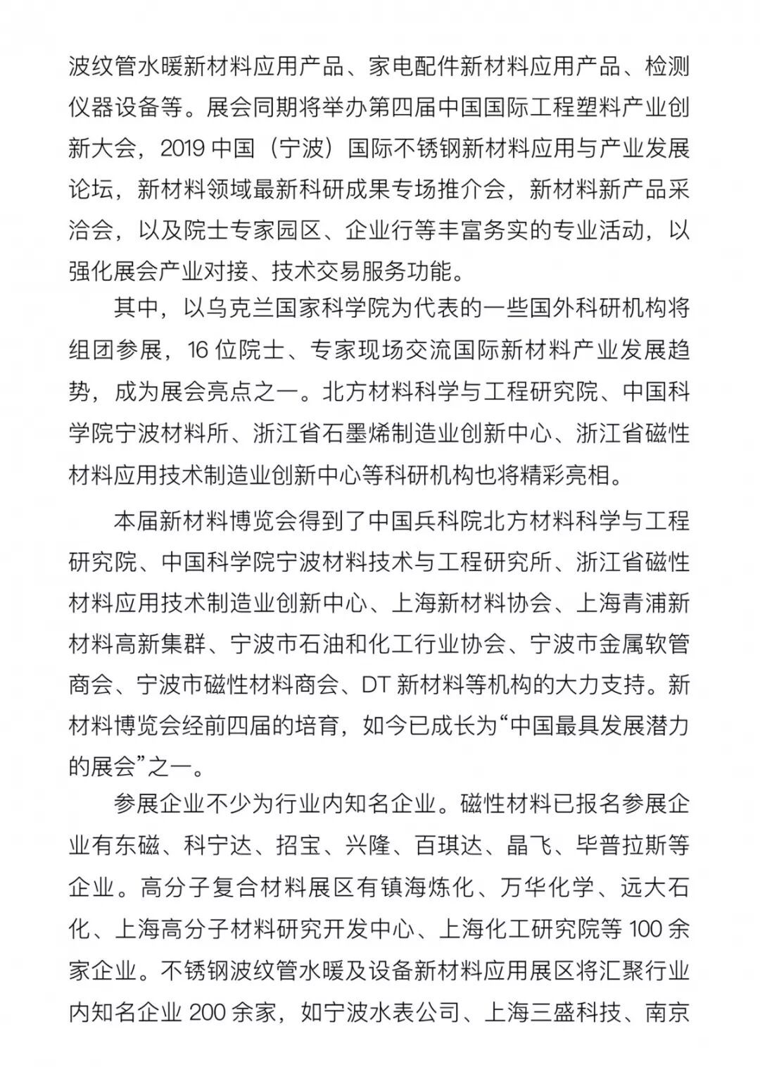 展会同期还将举办2019中国(宁波)新材料产业发展论坛、2019第四届中国国际工程塑料产业创新大会、2019中国国际功能高分子应用创新大会、首届中国(宁波)国际不锈钢新材料应用与波纹管产业发展论坛、长三角国际新材料产业与技术推介交流会、新材料领域最新科研成果专场推介会、新材料家电配件采洽会,院士专家园区企业行等活动,从而促进业界交流,为产业搭建全方位的交流平台。