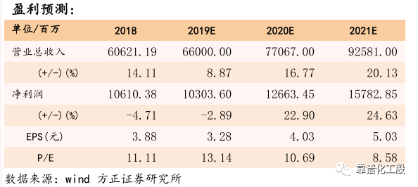 万华在建工程包括:聚氨酯产业链延伸及配套项目(175亿元)、大乙烯项目(175亿元)、美国一体化项目(86亿元)、BC系列项目(27亿元)、热电二期项目(14亿元)等。此外,根据环评公告,公司还拟建多项附加值更高的项目:35/30万吨高密度聚乙烯/聚丙烯项目(27亿元)、4万吨尼龙12项目(25.5亿元)、50万吨/年聚醚多元醇扩建项目(9.17亿元)、合成香料一体化项目(5.76亿元)、4000吨丙二胺系列产品建设项目(3.19亿元)、3万吨热塑性聚氨酯弹性体扩建项目(1.55亿元)等。新产品线的布局,有利于与原有产业链形成互补发展的局面,延长产业链,提高产品附加值和抗风险能力。6、投资评级与估值: 我们方正化工利用周期概率的方法,预测了未来三年公司MDI单吨净利润有80%概率保持在3454元/吨以上,对应2019-2021年万华中国区MDI业务净利润有80%概率分别保持在53、64、72亿元。我们预计公司2019-2021年归母净利润分别为103.04、126.63、157.82亿元,EPS分别为3.28、4.03、5.03,对应PE分别为13.14 、10.69、8.58,维持“强烈推荐”评级。7、风险提示