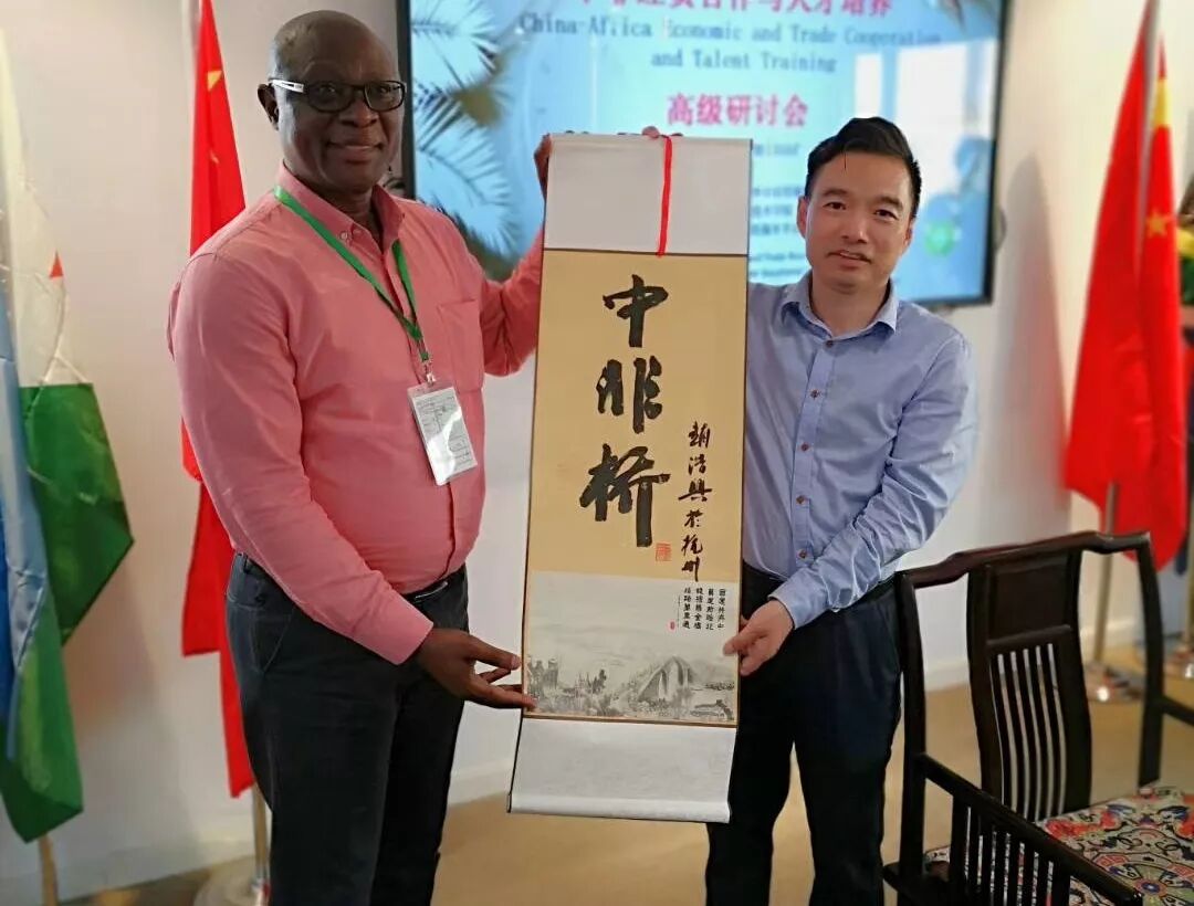 中非桥跨境贸易服务平台创始人赵浩兴教授热情地欢迎了各位的到来,并带领来宾们参观了浙江工商大学浙商博物馆、商大创业园和中非桥本部。中非桥应莺总经理深入介绍了中非桥跨境贸易服务平台,并就其中“精品制造”走向非洲、“精英创客”商行非洲、“精准营销”落地非洲等经验做法作详细阐释。活动中,中非桥惠子老师展示了中国茶道表演,让各位非洲来宾们大开眼界,同时,赵浩兴教授分别赠与了吉布提农业外交部副司长Ahmed Mohamed ABRO和刚果金金沙萨高等统计学院金融贸易部主任Georges Safary BYERAGI带有“中非桥”字样的字画,共同祝愿中非友谊长存。