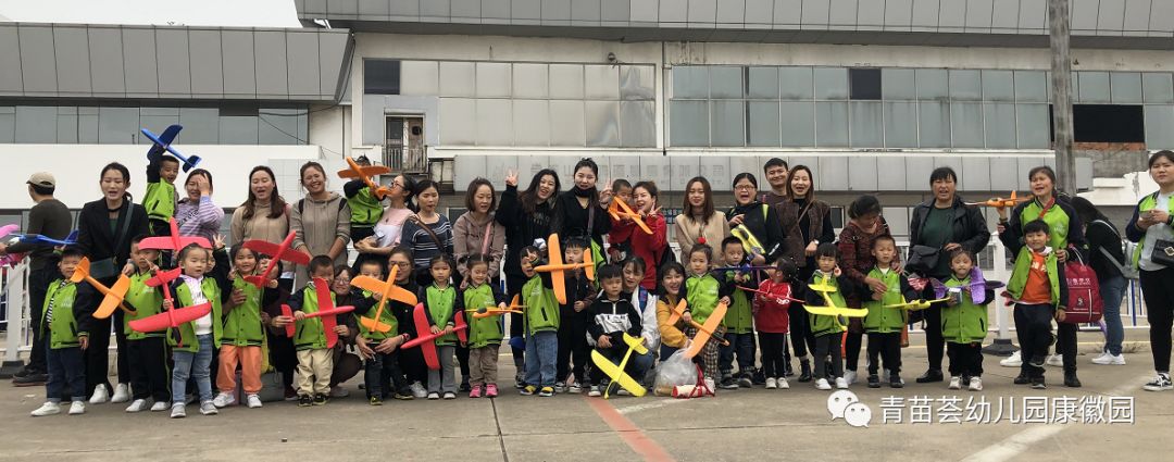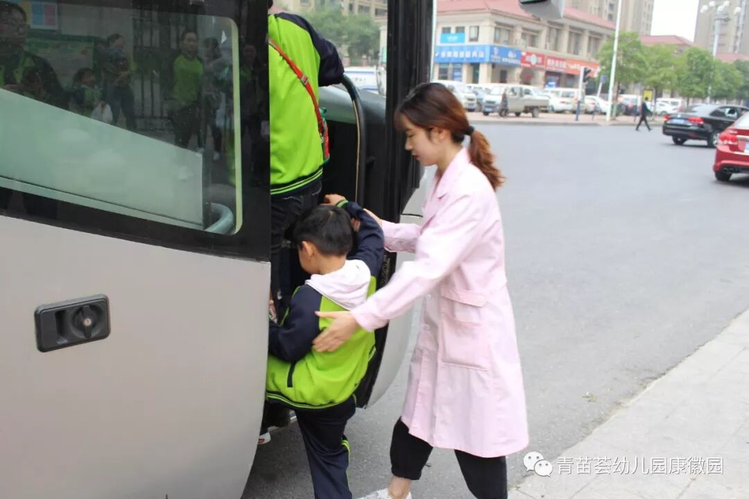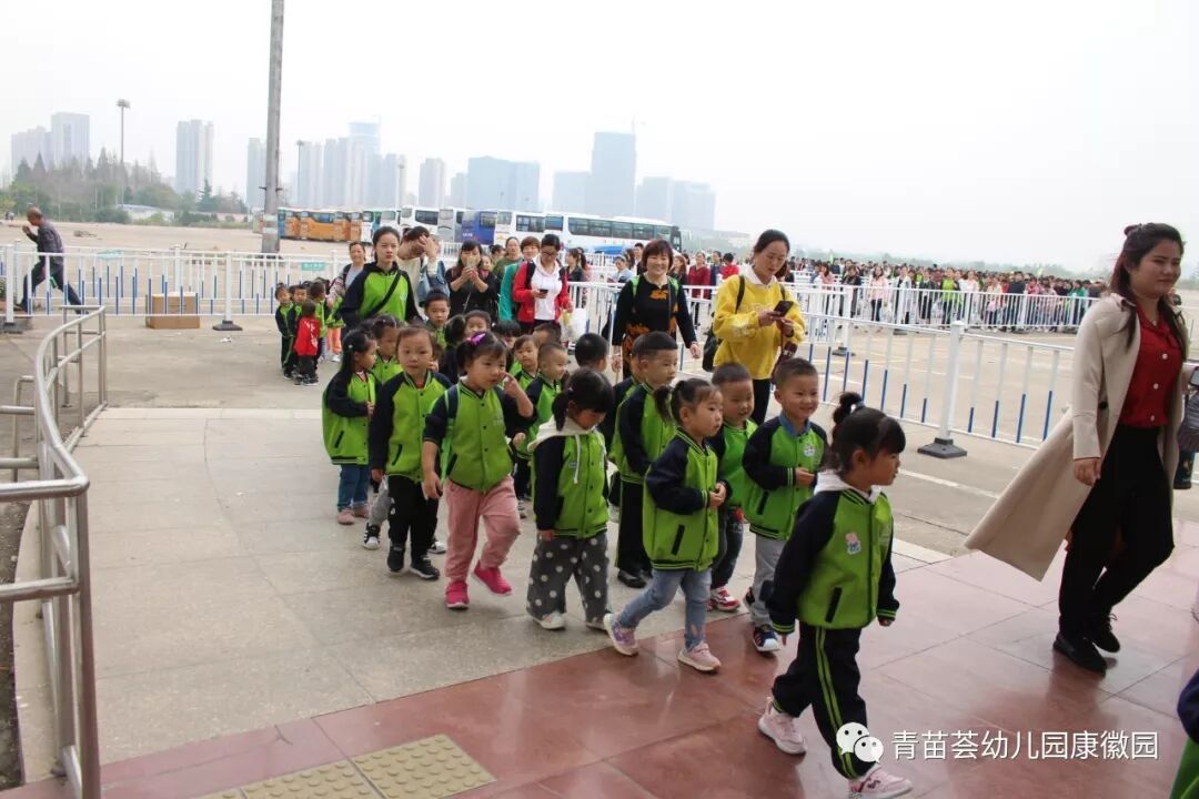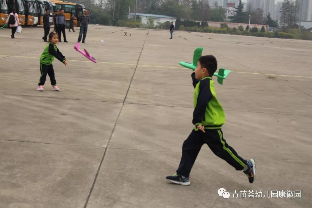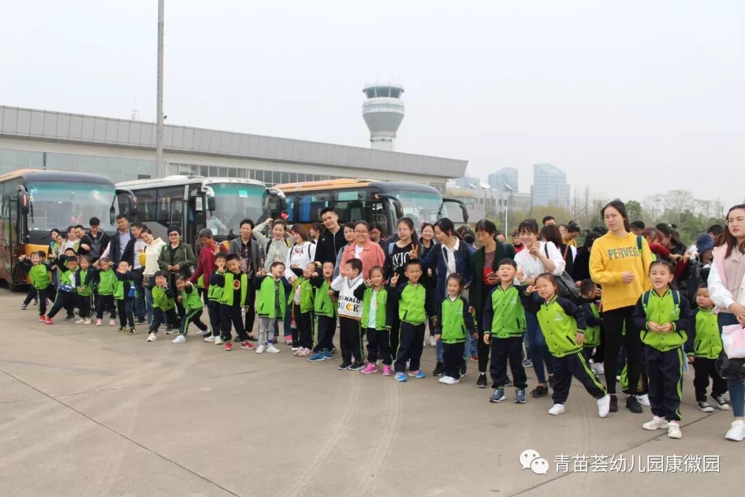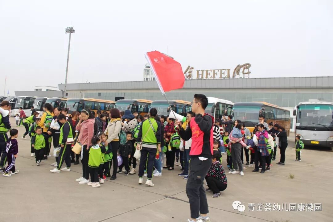 大巴车起航,康徽园庞大的队伍将分为15辆大巴车出发,小朋友们拿着幼儿准备的小点心,在欢歌笑语中前往第一亲子营地“飞机场”。