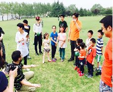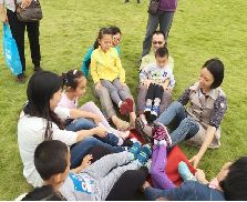 每个小组的成员,家长与孩子交叉站成一排,同穿一双鞋步伐一致,使学员感受到主动沟通和沟通的技巧的重要性。感受“无轨电车”带来的魅力。