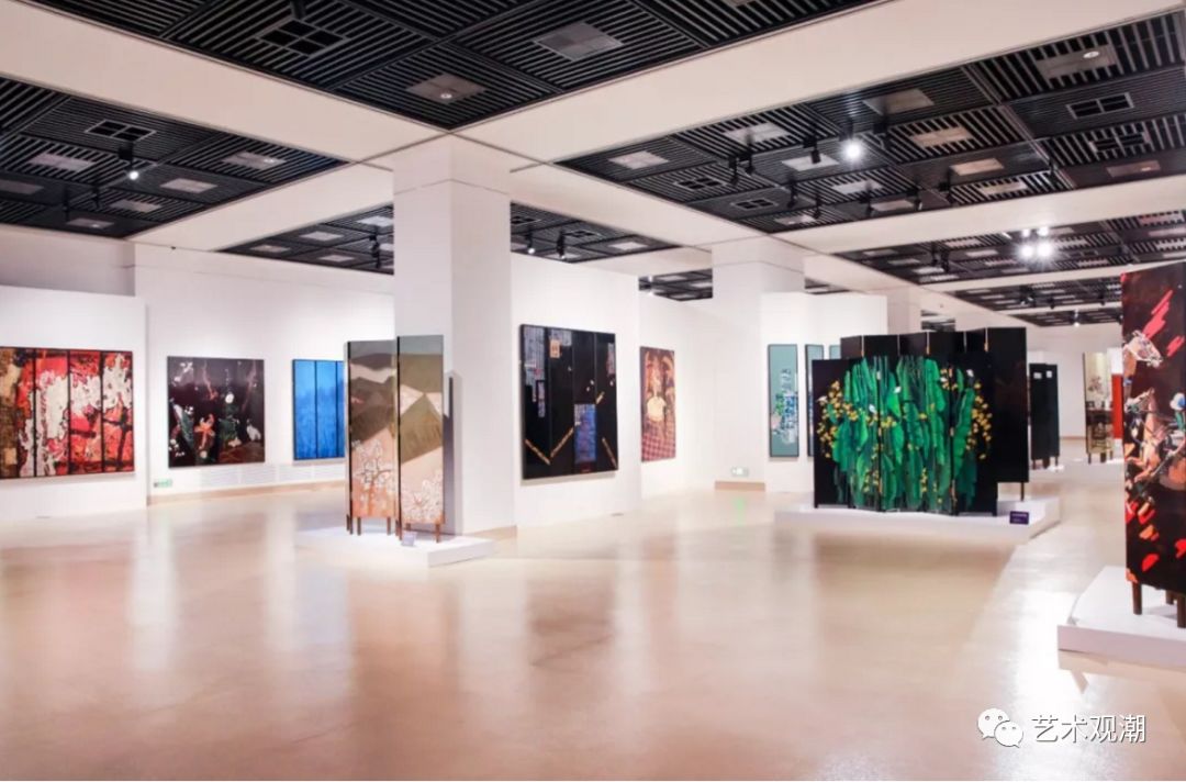 “首届全国漆画屏风作品展”呈现在海澜美术馆的二楼,著名漆画艺术家乔十光和中国美协漆画艺委会历届主任、副主任、委员及百余位知名漆画艺术家创作集中亮相。本次展览也是面向全国征稿,共征集到投稿作品268 件。9月6日,初评工作会在北京举行,共评出168件作品进入复评。9月23日,复评工作会在海澜美术馆举行,最终评选出100件作品参展,其中前40件作品获得一次加入中国美协的资格。除此100件参展作品之外,还特邀了31位著名漆画艺术家的作品参展。