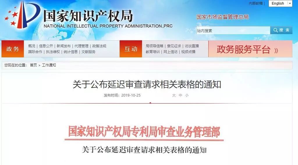IPRdaily导读:10月25日,国家知识产权局网站发布关于公布延迟审查请求相关表格的通知,将于2019年11月1日启用本次修订的表格,涉及修订的旧版表格将同时停止使用。