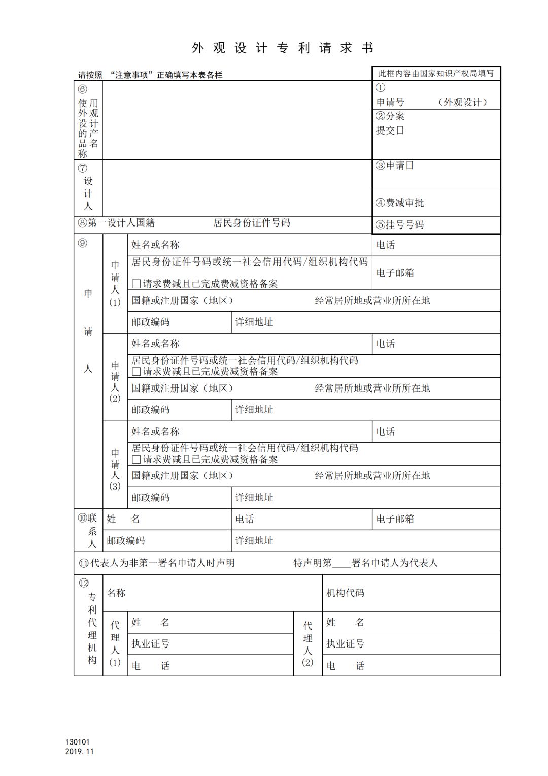 5.本表第9栏申请人是个人的,应当填写本人真实姓名,不得使用笔名或者其他非正式的姓名;申请人是单位的,应当填写单位正式全称,并与所使用的公章上的单位名称一致。申请人是中国单位或者个人的,应当填写其名称或者姓名、地址、邮政编码、统一社会信用代码/组织机构代码或者居民身份证件号码;申请人是外国人、外国企业或者外国其他组织的,应当填写其姓名或者名称、国籍或者注册的国家或者地区、经常居所地或者营业所所在地。申请人请求费用减缴且已完成费减资格备案的,应当在方格内作标记,并在本栏填写证件号码处填写费减备案时使用的证件号码。