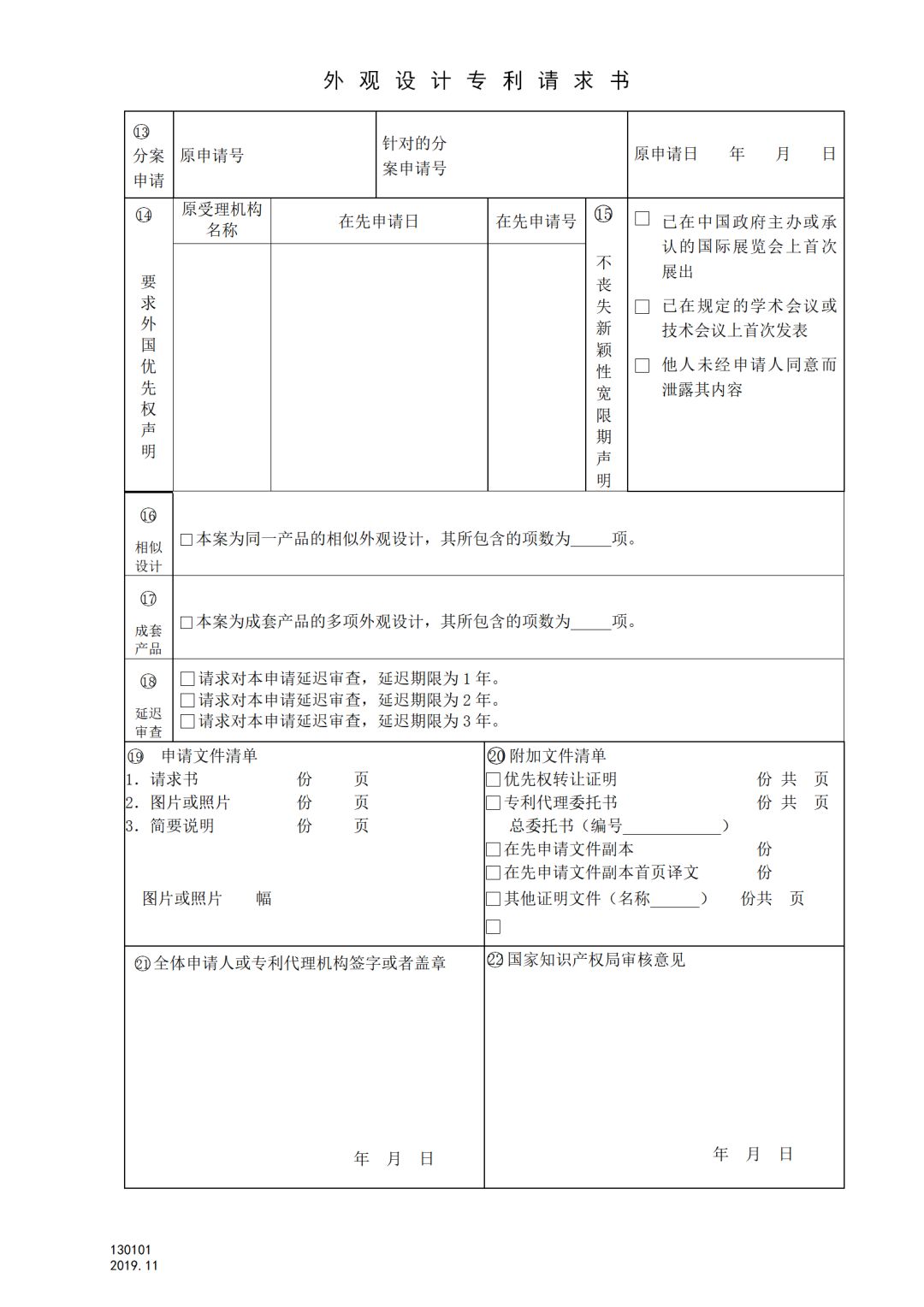 13.本表第17栏,用于同一类别并且成套出售或者使用的产品的两项以上外观设计,作为一件申请提出时,申请人应当填写相关信息。成套产品外观设计专利申请中不应包含某一件或者几件产品的相似外观设计。
