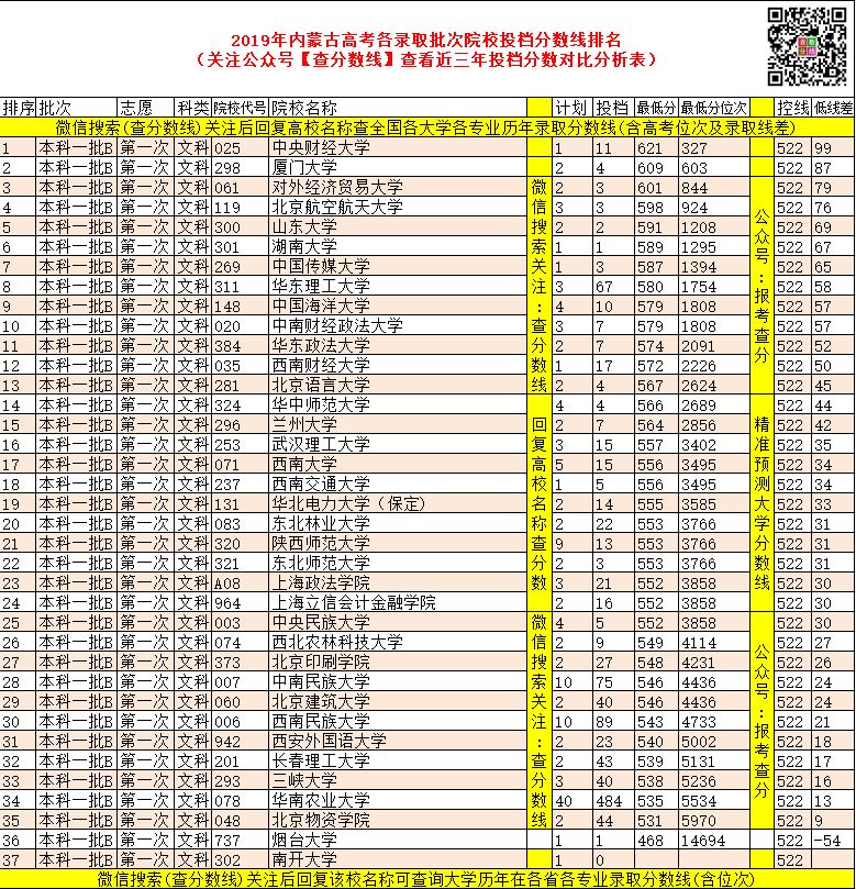 2019年内蒙古高考本科一批B院校文科投档分数线排名