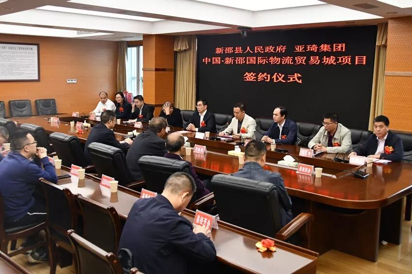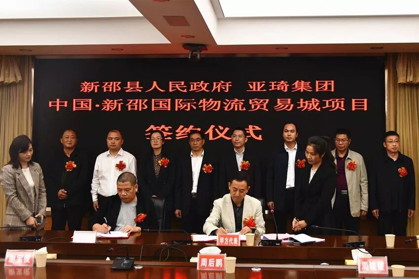 10月23日,新邵县举行中国·新邵国际物流商贸城项目签约仪式。该项目总投资人民币50亿元,占地950余亩,将建设集物流仓储、信息交易平台、商品交易市场及相关配套项目于一体,涵盖家具家居、五金机电、数码家电、汽摩配件、百货商品、名优特产等领域的现代化大型物流商贸创新园区。