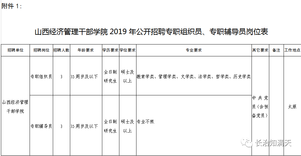 山西经济管理干部学院2019年公开招聘专职组织员3名、专职辅导员3名,招聘岗位及所需的具体条件详见附件1《山西经济管理干部学院2019年公开招聘专职组织员、专职辅导员岗位表》。