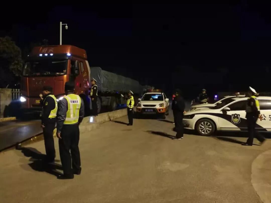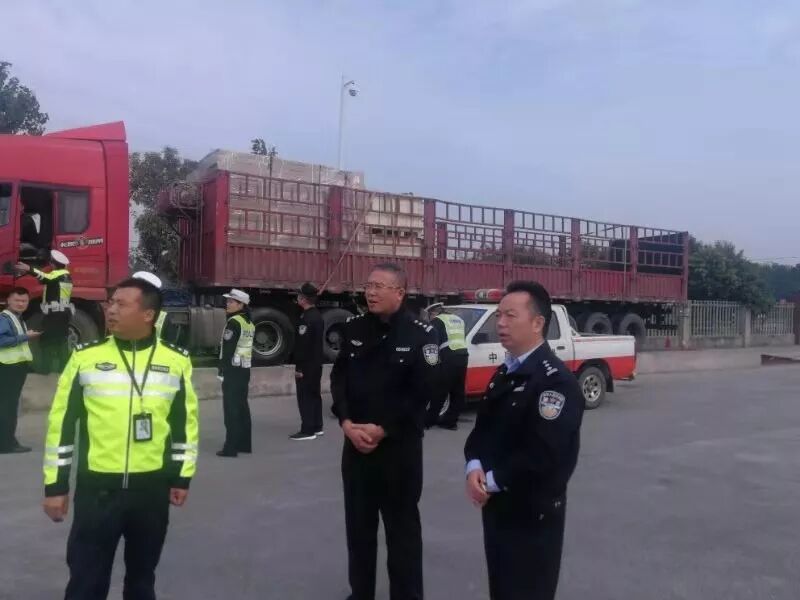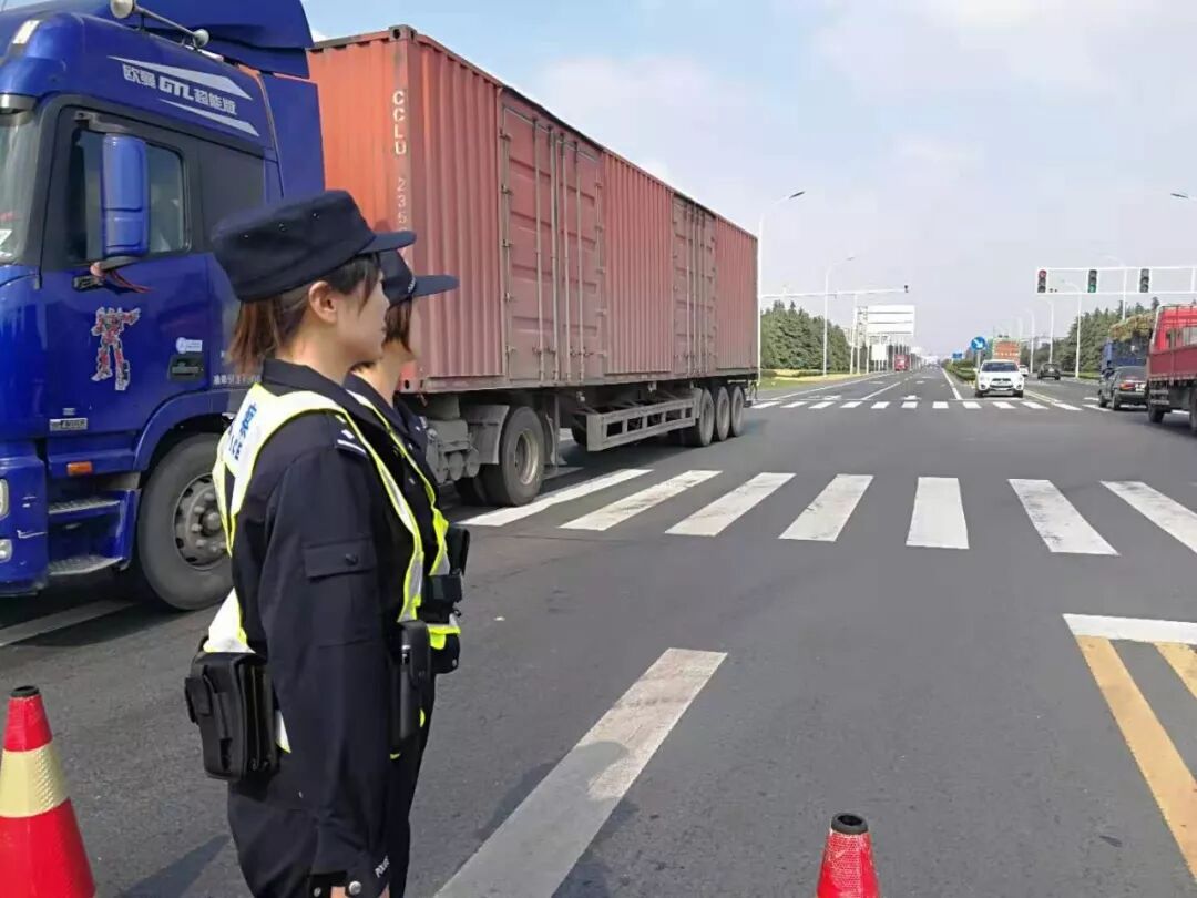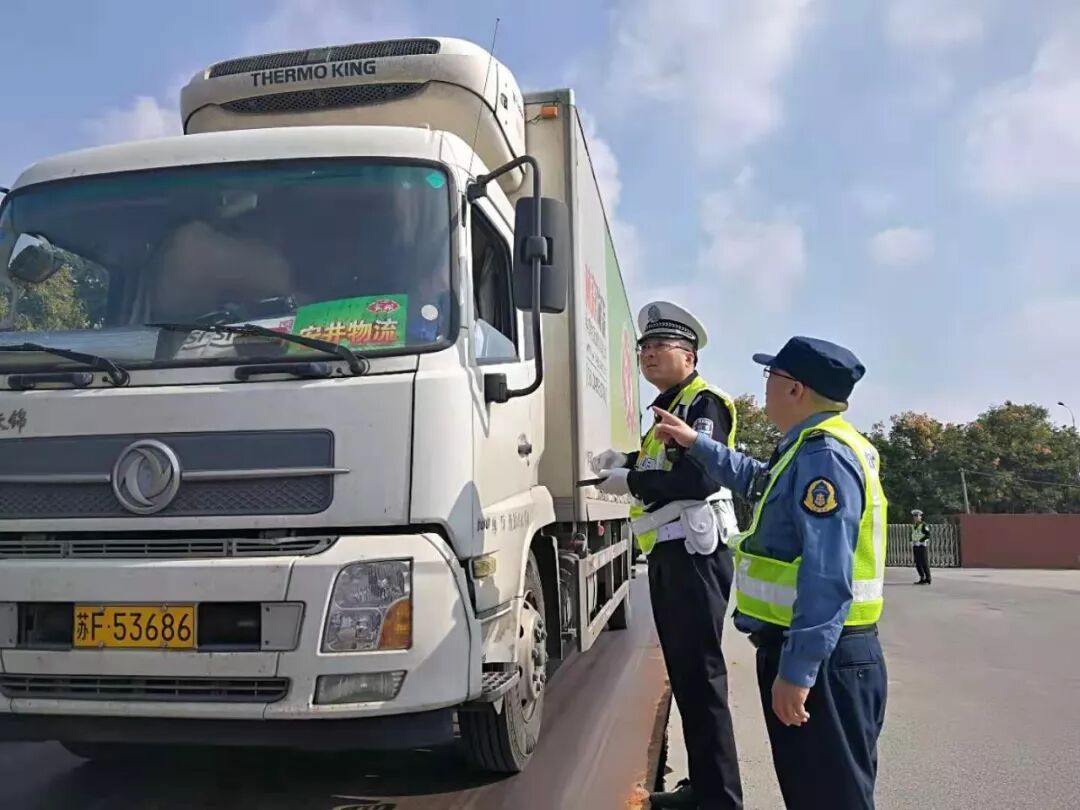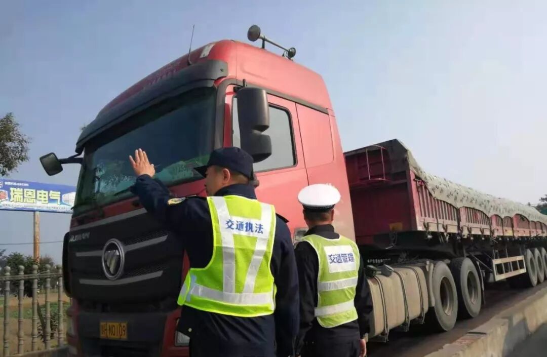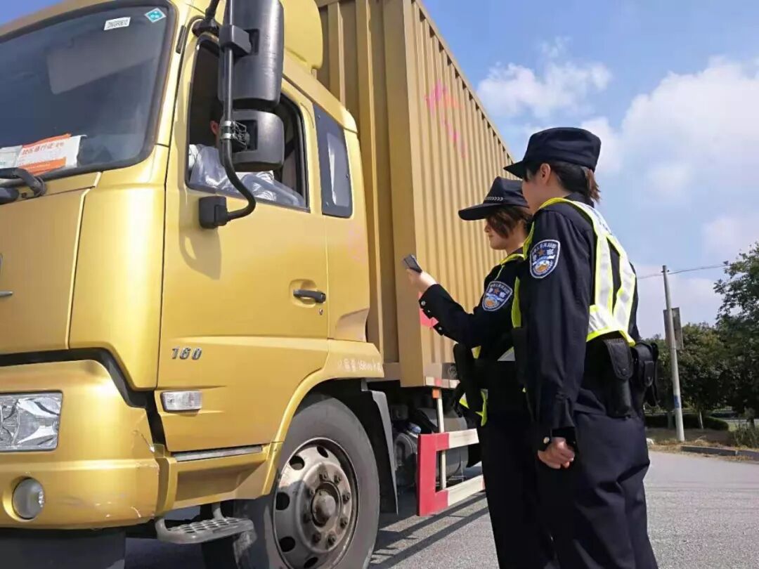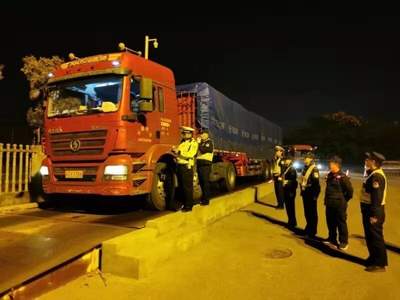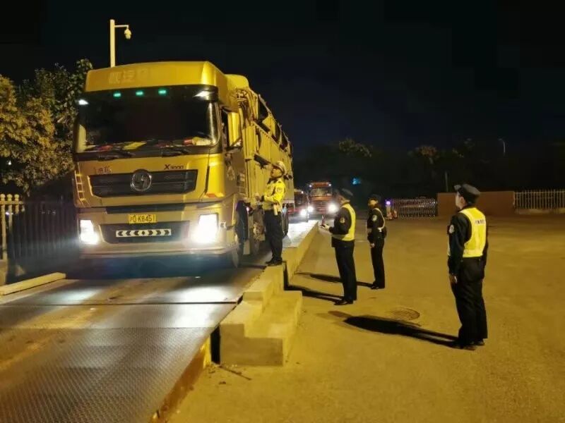 2019年10月18日上午,海安市公安局交通警察大队高新区中队民警崔建峰、吴坚强在海安市烟沪线黄海大道路口超限检测站与交通运输管理部门开展联合治超行动。
