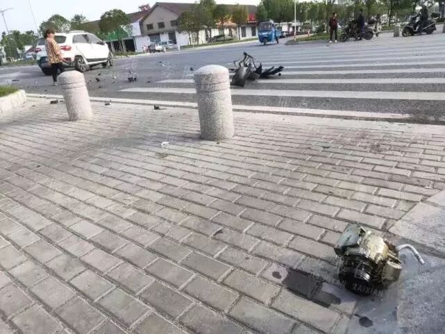 路面上到处散落着车辆碎片和零部件,道路西北侧树木的石围栏被撞坏。令人心惊的是,白色轿车的一只大灯被撞飞到了西边数十米的路面上,两车之间的路面上还有一只不知道从哪辆车里掉出来空调泵,可见当时的撞击力度之大。