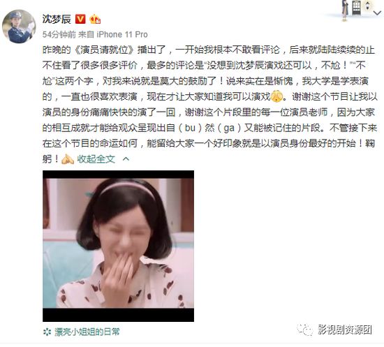 10月26日,沈梦辰发文评价了自己昨晚在《演员请就位》中的表演,表示网上网友的评论“不尬”是对自己最好的鼓励。她说自己是学表演的,一直喜欢表演,上这个节目的初衷也是希望观众们可以知道沈梦辰也是可以演戏的。她还感谢了节目中的老师和嘉宾,希望接下来自己可以继续加油
