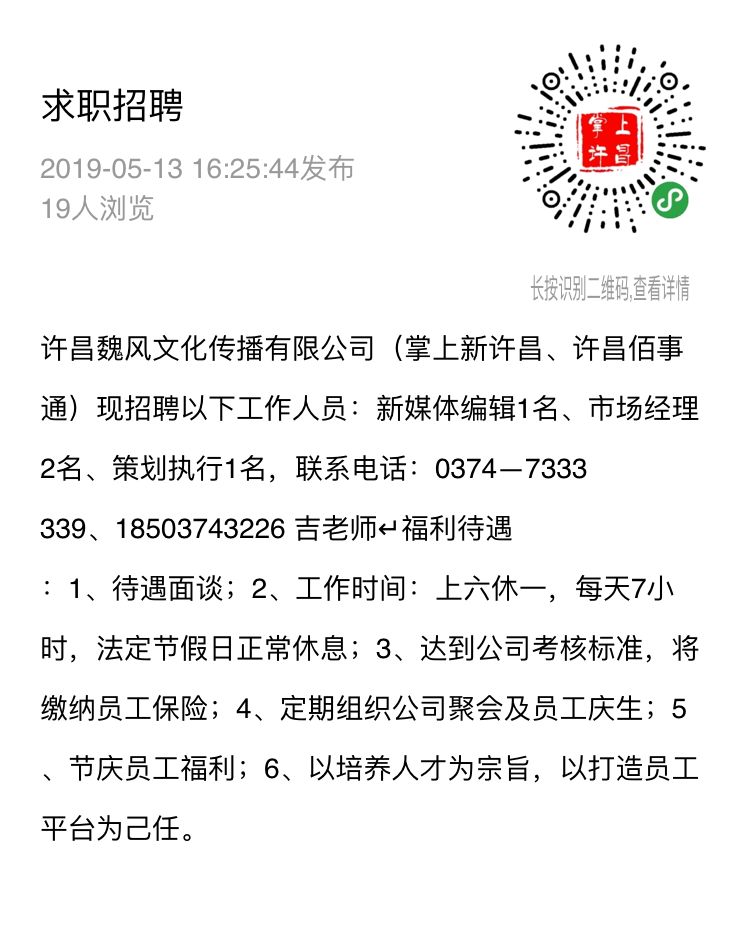 许昌魏风文化传播有限公司(掌上新许昌、许昌佰事通)现招聘以下工作人员:新媒体编辑1名、市场经理2名、策划执行1名,联系电话:0374—7333339、18503743226 吉老师