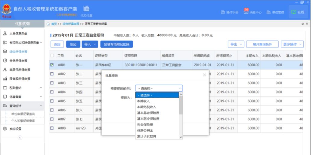 (2)当需要修改的人员较多,且修改的数据项和金额一致时,可点击【批量修改】,对选择的人员进行更正。