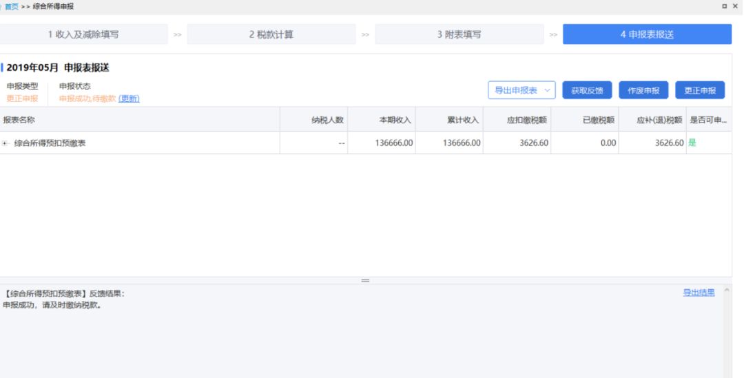 2.点击【综合所得申报】进入申报填写界面,点击【4.申报表报送】查看申报结果。 3.点击【更正申报】,可启动更正申报功能。 ①系统提示是否进行更正申报,点击【确定】进入更正申报界面。 ②更正往期申报,目前系统不允许新增人员,若要新增人员,需前往办税服务厅更正。更正申报成功后,需要对后期申报表进行逐月更正,否则将影响后期申报表的累计计算税功能”