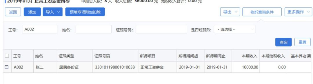 2.导入申报表修改方式下: 需要修改的人员信息较多,不便于一条条选择修改时,可通过导入申报表进行更正。导入申报表时,可导入全部人员明细(不需要修改的人员明细保持不变),也可以只导入需要修改的人员明细(导入模板中将不需要修改的人员明细删除)。同时,系统提供【导出】功能,可导出原申报表明细,扣缴单位可在导出明细基础上进行修改。 需要特别关注的是,导入的申报表要包括收入、专项扣除、专项附加扣除等明细数据。如只填写收入,未填写其他明细,原申报表的其他明细金额(除专项附加扣除)将被清零。 导入申报表前的原始明细数据: