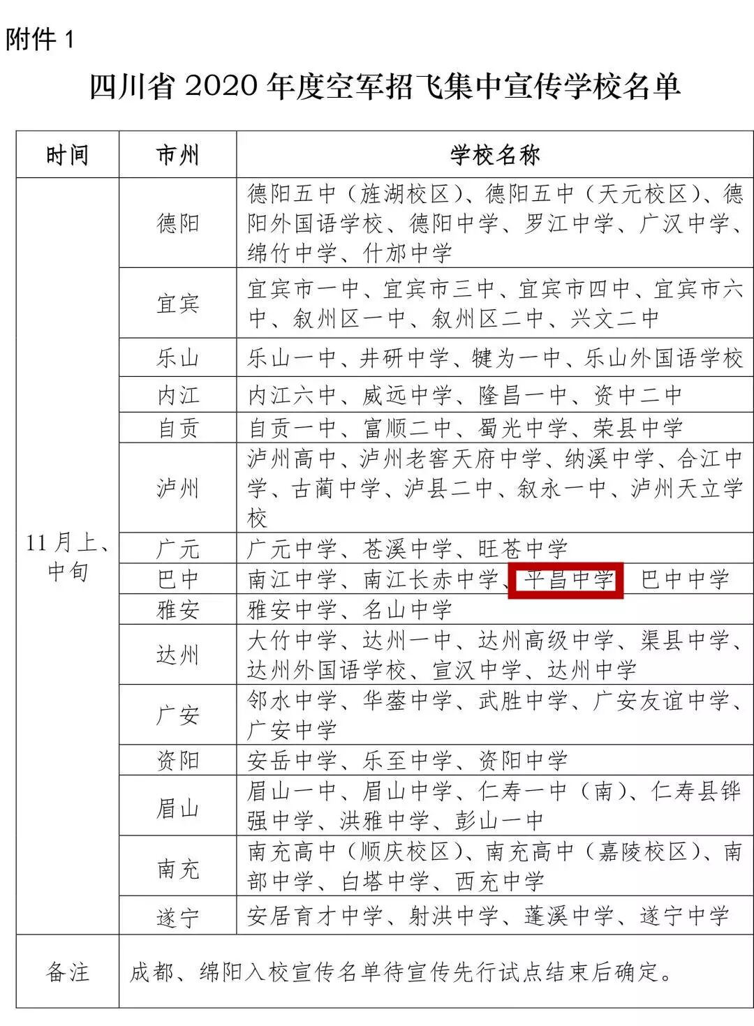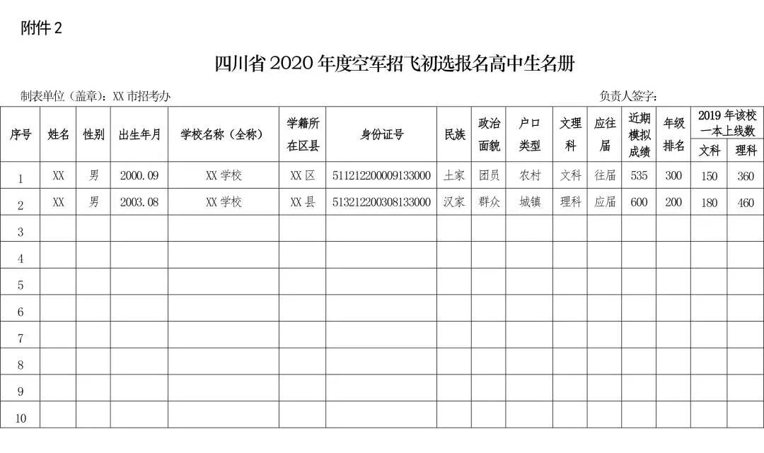 三、工作安排我省2020年度空军招飞工作,从2019年10月开始,到2020年7月上旬结束,具体分7个阶段实施。(一)动员报名1. 普遍发动。①在成都、绵阳两个市开展宣传先行试点,由当地市级招考办牵头,在空军招飞局成都选拔中心开展入校宣传前,先行部署空军招飞工作,通过当地主流媒体和官方网站、微信公众号等平台,介绍空军招飞的目的意义、报考条件、政策待遇和培养目标,认真做好政策解读;督促辖区内县(市、区)招考机构和相关学校,集中利用专门时间,采取有效措施,面向高三毕业男生及家长开展空军招飞宣传,吸引广大学生报名空军招飞;②其余市(州)各级招考机构也要结合辖区生源实际,及时向社会发布招生信息,采取有效措施,指导督促辖区学校发挥好教育引导的主体作用,积极营造踊跃报考的良好氛围。2. 入校宣传。11月上旬开始,空军招飞局成都选拔中心将派出宣传小组,会同各市(州)招考办深入全省17个市(州)的部分高中,开展面向学生、家长和老师的入校宣传动员,并现场对报名学生的视力、身高进行把关,其余中学可视情组织符合基本条件的学生(家长)前往相关中学参加宣讲。各市(州)招考办及有关学校要明确负责部门和责任人,安排专门时间、场地和人员,积极配合成都选拔中心宣传人员开展入校宣传和身体把关。3. 组织报名。各市(州)招考办指导督促辖区内相关学校严格按照通知中明确的报名条件,对报名学生的身体、文化等情况进行把关,并初步拟定报名学生名册。成都、绵阳于10月25日前,其余市(州)于11月15日前将推荐报名学生名册汇总后报空军招飞局成都选拔中心(电话:028-85399171,QQ邮箱:1143298580@qq.com),经审核合格后通知学生上站参选。(二)文化审核空军招飞局成都选拔中心在入校宣传期间,将对把关预留的学生成绩进行现场收集,初选结束后,各市(州)招考办牵头,按照空军招飞局成都选拔中心的相关要求,结合合格学生每次校级以上考试成绩、年级排名,给出评估意见,为后期选拔检测、政治考核等工作夯实基础。(三)初选1. 时间安排:2019年11月中、下旬(具体日程安排以成都选拔中心通知为准)。2. 初选站设置:分别在成都、绵阳、遂宁、南充、乐山、宜宾、内江、泸州、巴中、广元、德阳、资阳、眉山、达州、广安、雅安、自贡等地市设17个初选站;甘孜、阿坝、凉山、攀枝花4个市(州)学生就近上站参选,亦可在当地人民医院按《报名体检表》体检项目自行体检,并于11月30日前将体检报告寄至成都选拔中心计划科审核(地址:成都市武侯区共和路2号,邮编:610061,联系电话:028-85399171)。3. 注意事项:学生须持身份证(无身份证可持户口簿)、《报名体检表》(见附件3)按时到指定地点参加初选,各市(州)招考机构要督促相关中学严格按通知要求,指派专人带队,严密组织。学生免收检测费用,交通食宿费用自理;带队老师可凭有效车票,由空军招飞局成都选拔中心按军队有关规定给予核销(或按各单位规定自行核销),不再发放其他费用及补助。(四)分阶段定选1. 高考前定选。2020年2月至3月,依照空军招飞局统一部署,集中组织四川大学附属中学、四川省绵阳中学2017级航空实验班学生和部分文化成绩靠前的非航空实验班学生参加定选检测。2. 高考后定选。高考成绩公布后,组织达到推荐线的学生(含初选合格未参加高考前定选以及一次性上站的)参加定选(具体安排届时另文通知)。(五)政治考核2020年3月至7月,由空军招飞局成都选拔中心分批组织相关学生进行政治考核。(六)保苗方法步骤:一是初选结束后,各市(州)招考办要督促指导相关学校安排专人与初选合格学生进行谈心,重点在视力保护、坚定志愿、文化成绩等方面做出明确要求。二是高考前定选结束后,相关单位要制定具体的保苗措施,采取灵活多样方式从坚定报考意愿、做好身体保护、提高文化成绩等方面有针对性地固强补弱。三是相关学校要积极同学生家长联系,重点介绍空军招飞的政策要求,强调保苗工作的重要性,明确保苗内容和方法,争取家长的参与支持。四是结合政治考核外调,安排外调人员走进学校协调指导保苗工作,跟踪了解掌握学生思想、文化和身体情况,确保保苗措施落到实处。(七)录取高考成绩公布后,空军招飞局按照我省年度任务指标,对定选合格学生依据《献身国防事业志愿书》、高考成绩(含政策加分),参照体格检查、心理选拔和政治考核结论进行综合择优录取(录取时不区分文理科,按照学生高考投档分与文理科一本线的比值得出可比系数统一排序,具体录取原则待空军招飞局明确后另行公布)。清华、北大、北航三校“双学籍”学生在已被录取的理科飞行学员中,由空军招飞局联合三所高校进行二次录取。(点击文末阅读原文下载附件):1.四川省2020年度空军招飞集中宣传学校名单2.四川省2020年度空军招飞初选报名高中生名册3.空军招收飞行学员高中生报名体检表