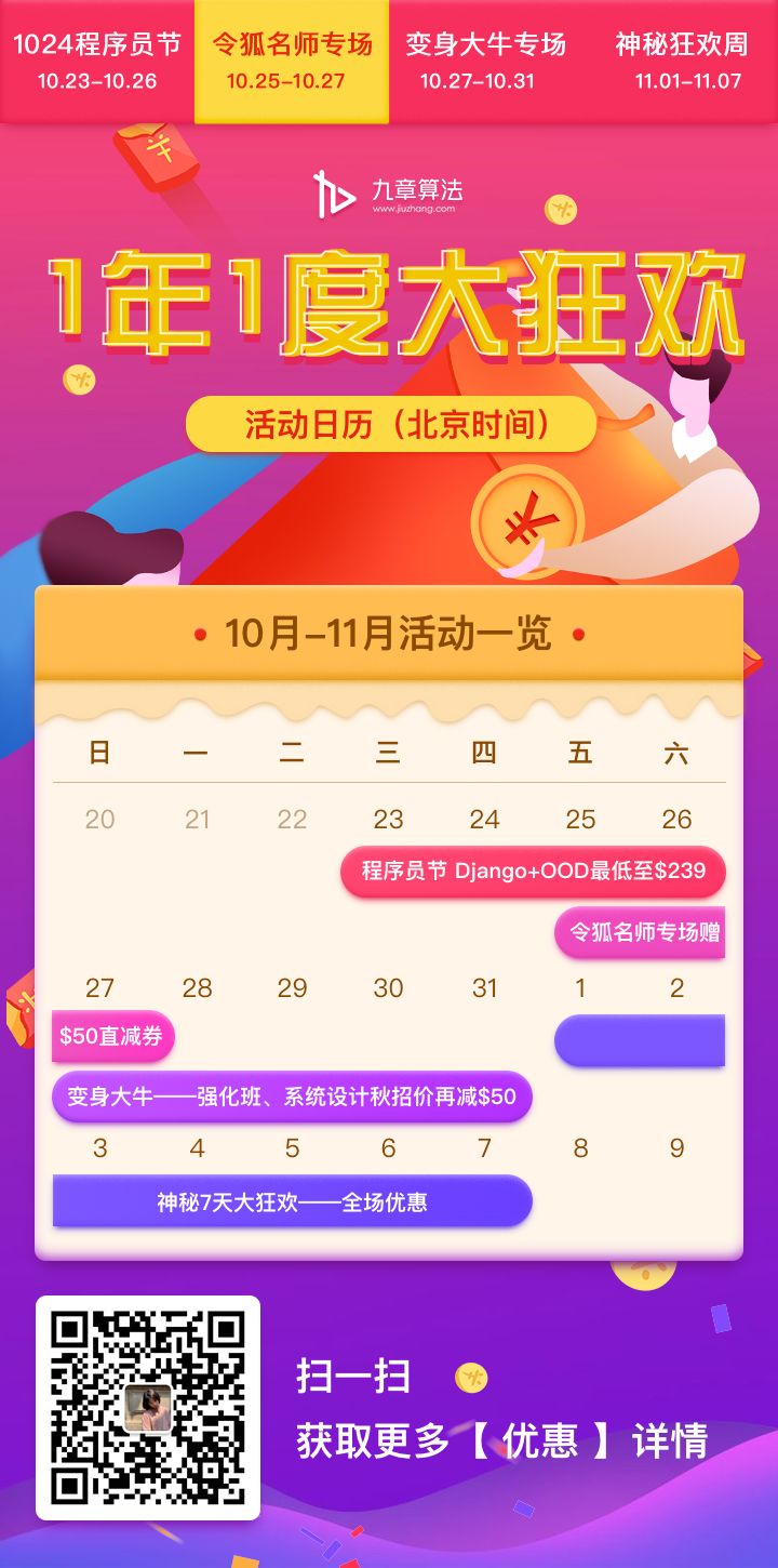 也许关注九章的盆友们会发现,趁着10·24程序员节,我们推出了Django和OOD课程特价活动,其一是好评超高的迅速入门项目课,另一个是针对new grad常考的设计题。这两门课程直降至$239,可以说是相当实惠了。