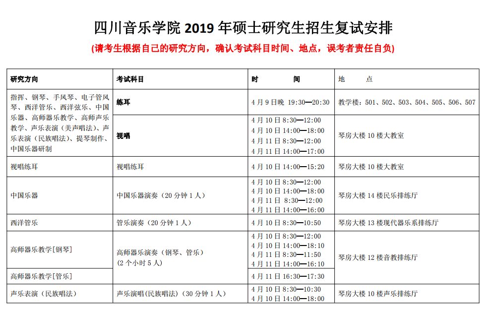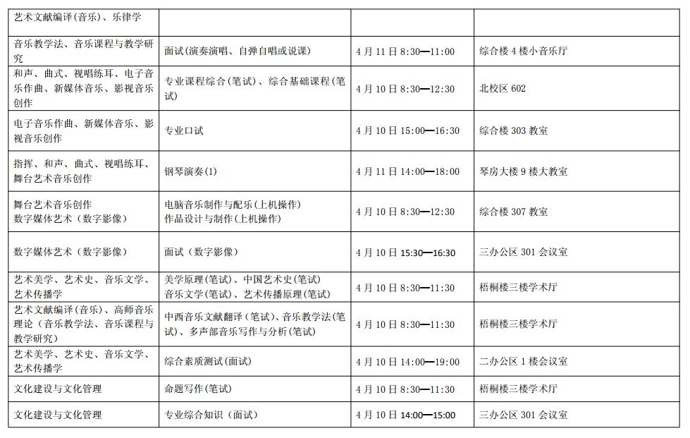 注:中国乐器、西洋管乐、西洋弦乐、钢琴、手风琴、电子管风琴、高师器乐、高师声乐、声乐表演(美声唱法、民族唱法、流行唱法)、指挥各研究方向考生,在 4 月 9 日领取专业准考证时抽签决定主科考试顺序。