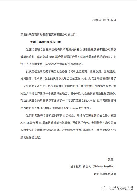 联合国驻华协调员致粮忻谷都公司的致谢信