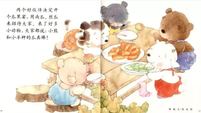 两个好伙伴决定开个瓜果宴,用南瓜、丝瓜来招待大家。来了好多小动物,大家都说:“小熊和小羊种的瓜真棒!”