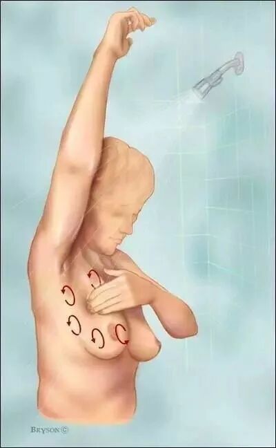 2.淋浴检查法:淋浴时,手指指腹进行检查乳房的各个部位及腋窝是否有肿块,检查乳头是否溢液;
