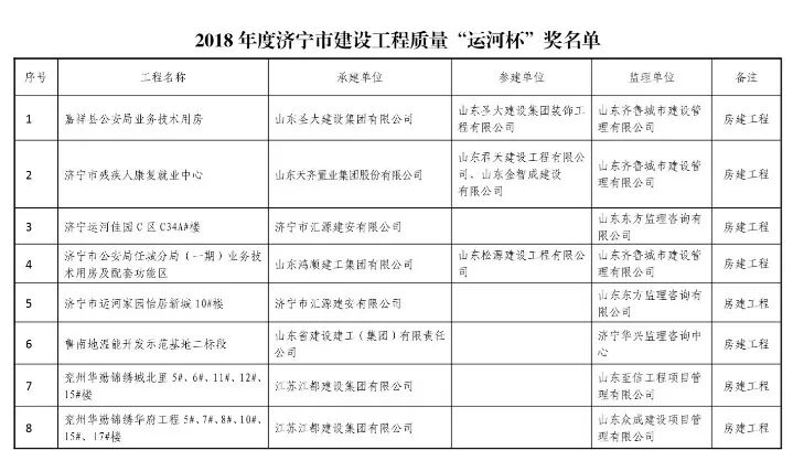 嘉奖来了!济宁61个工程荣获2018年度建设工程质量“运河杯”奖(附名单)