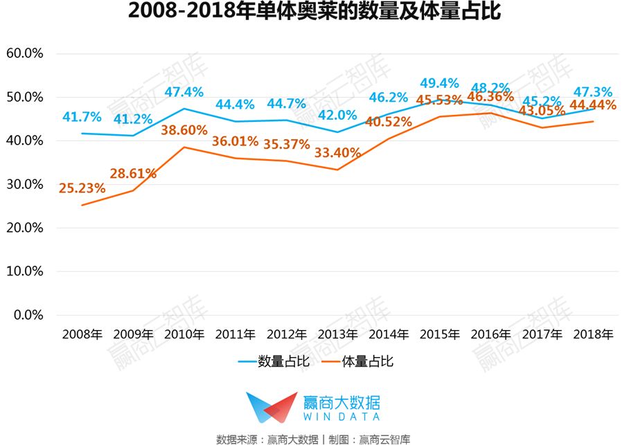 2008年至2018年,连锁奥莱项目的数量占比稳定在50%至59%之间,体量占比则由2008年的75%降至2018年的55%,这是因为单体奥莱不断入市,稀释了原有比例。