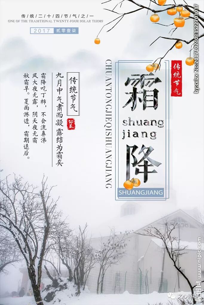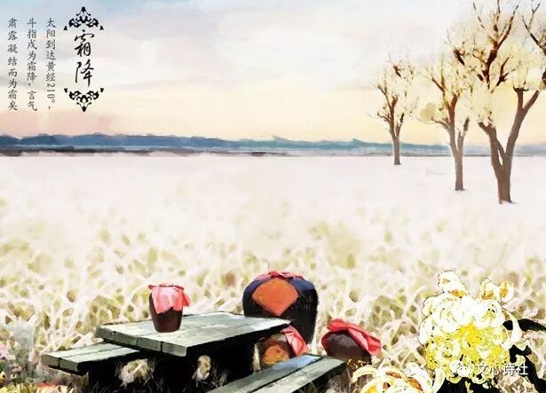 霜降来临寒廖寂,菊花凋谢凝成霜。