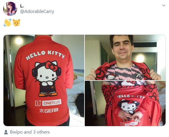 FNC上单Bwipo的女友晒出FNC的新“队服”,粉色的HelloKitty主题。