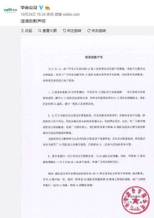 iG粉丝们一看到就不乐意了,因为11月10号就是世界赛的决赛,商业活动时间约在8号,难道是自家管理都认为iG会提前回家,没办法进决赛吗?可真是有点好笑呢。24日下午,活动主办方发布致歉声明,表示活动图仅是测试版本,并非完全确定,保密工作没做好,意外泄露出去。届时活动会由iG2队参加,对不完整活动内容流出,对iG造成不良影响,真诚道歉。