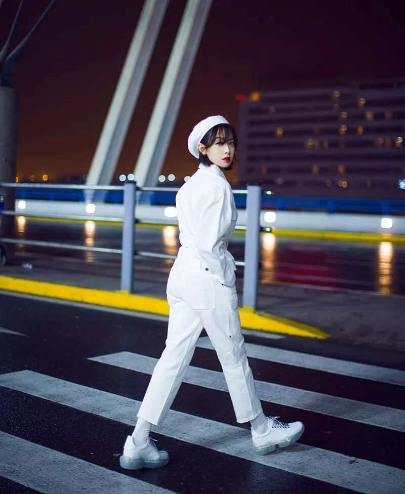 连体工装由于色彩的连贯性,在视觉效果上可以拉长身材比例。因为服装元素的单一,穿连体工装时配饰的搭配很关键,不同的配饰风格各异。