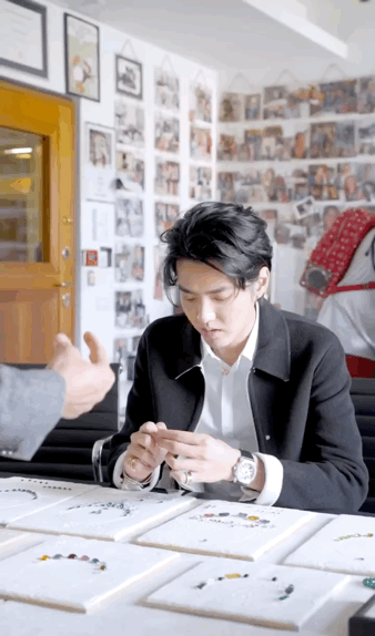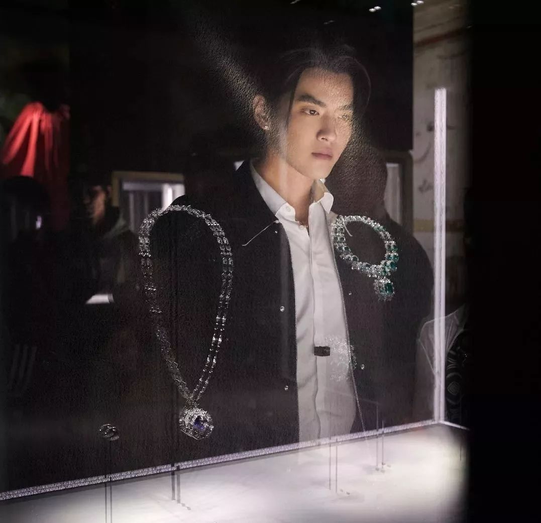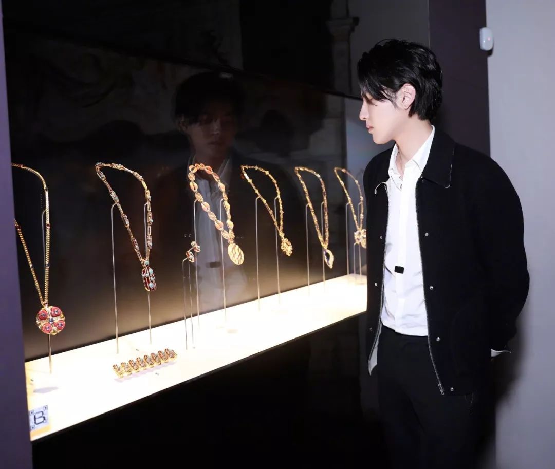 当我看到他的时候,这位宝格丽代言人正在仔细端详着一件件流光溢彩的珍宝,在细碎钻石隐射的光华之下,他的面容都虚焦啦——(你们自己说,你们到底要先看珠宝,还是先看吴亦凡……)