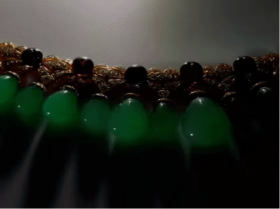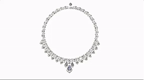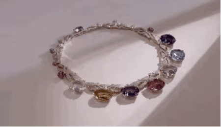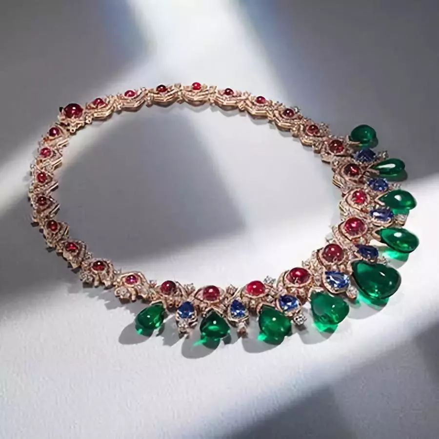 这款项链由 104 克拉的祖母绿滴、56克拉的红宝石以及纯净的蓝宝石结合,从打磨、连接需要 800 多个小时,最后的效果也的确让人觉得十分甜蜜。
