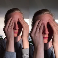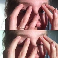 ▲做法:针对于眼睛的按摩,这个按摩可以帮助眼睑,防止双眼下垂,如图所示,将三个手指的指腹放在眉骨上,轻按并提起。然后紧闭双眼,保持1秒钟,重复10次,5组。最后一次闭眼保持10秒钟。