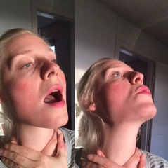 ▲做法:针对于脖子和下巴的线条,这个按摩可以紧致颈部同时消除双下巴,如图所示,将你的手放在锁骨上,将舌头放在前牙后面的柔软底部上,抬起头,同时双手紧握以抵抗阻力,感觉要亲天护板,保持1秒钟,然后回到起始位置,重复10次,5组,最后一次保持10秒钟,再放松。