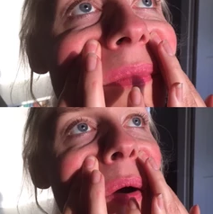 ▲做法:针对于脸颊的按摩,这个按摩可以调理脸部的所有肌肉。如图所示,嘴巴微张为o形,此时你要保持脸部的放松舒展,然后在保持o形的同时,尝试微笑,抬起嘴角,你会感觉到颧骨抬起,保持微笑1秒钟,然后放松,重复10次,做5组,最后一个微笑保持10秒钟。