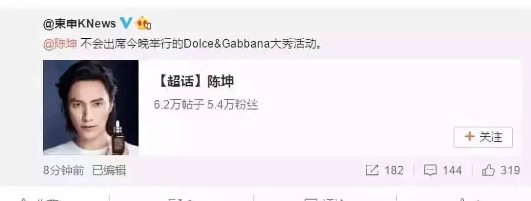 以及DG的两位中国区大使王俊凯、迪丽热巴也都先后表示不会出席当场活动,并解除了与DG的合约关系,通知服装师不要再借DG的衣服↓